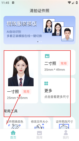 1、进入清拍证件照首页,选择【一寸照】-【25mm*35mm】规格,还可使用【证件照换底色】等常用工具辅助制作。