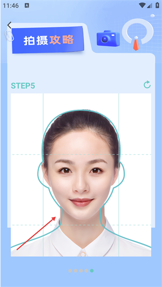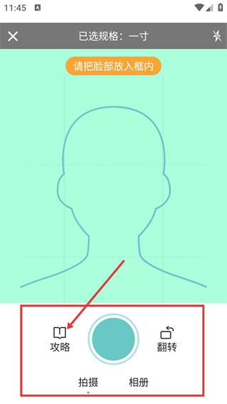 4、点击【攻略】查看拍摄步骤,参照示例将脸部放入对应框内,完成证件照拍摄的前期准备。