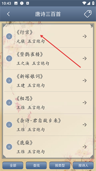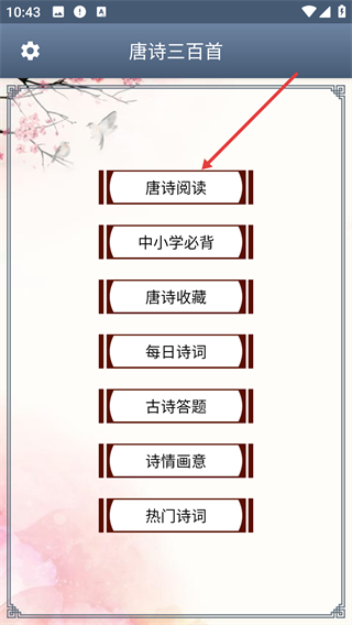 2、在功能选择界面点击【唐诗阅读】选项,进入唐诗列表页面后,即可浏览《唐诗三百首》里的作品。