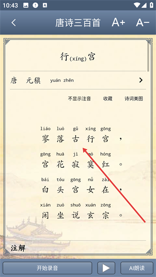 4、进入《行宫》的详情页面,不仅能查看诗词的完整内容和拼音标注,还可以借助【AI朗读】等功能来辅助诵读与学习。