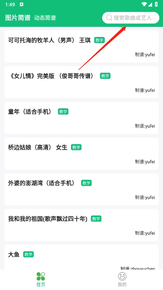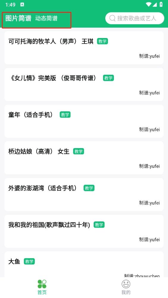 2、进入软件,首页可以选择图片简谱以及动态简谱,图片简谱就是上下滚动,动态简谱就是跳转到每一个音符。