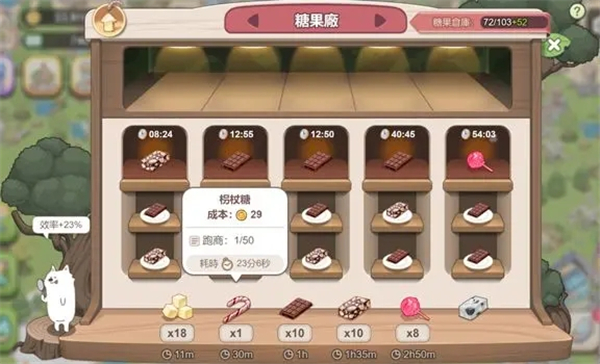解锁工厂后,一开始能生产1种食物,通过升级等级树可以解锁更多种类的食物。你可以点击底部的食物,或者把食物拖到生产格子里来开始生产。长按食物的话,就能看到单个食物的成本、制作时间、现有数量,以及当前跑商需要的数量。