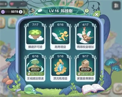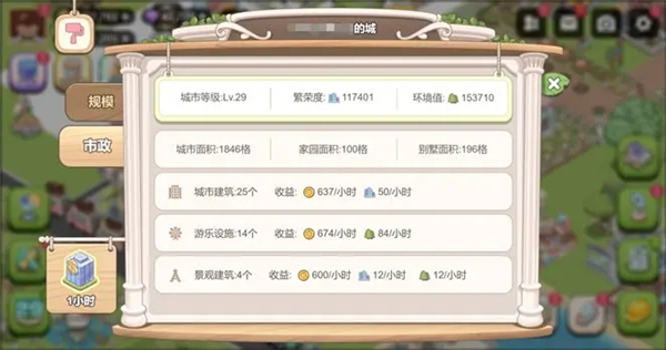 城建装饰出自等级树的繁荣线任务,涵盖基建设施、游乐设施与景观三类。已竣工的基建设施每小时可产出金币和繁荣度,已竣工的游乐设施每小时能产出金币和环境值,景观每小时则会产出金币、环境值及繁荣度,且这三类设施在收纳后,其每小时的产出并不会受到影响。