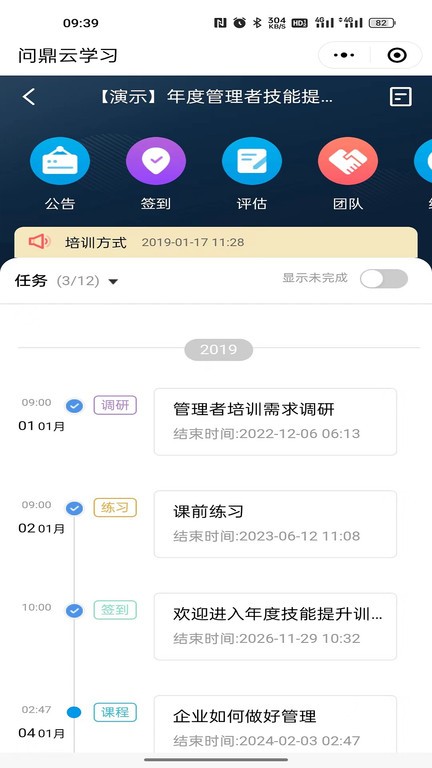 1、在问鼎云学习应用首页,点击底部【课程】按钮,进入课程分类列表页面。
