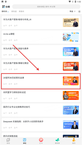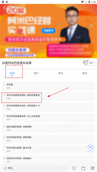 2、在课程列表,选择目标课程(如“20堂阿米巴经营实战课”),进入课程详情页。