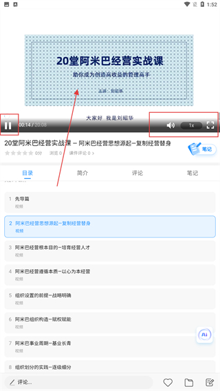 4、进入课程播放页面,可通过暂停键、音量/倍速调节、全屏按钮等功能,控制学习进度与播放体验。