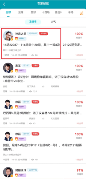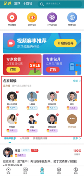 指名人专家依托自身专业能力,对比赛进行全方位、多层次的专业剖析,并提供赛果推荐的服务。目前提供足球和篮球两类解读,足球支持胜负彩、任选9场和竞彩足球(单关、亚盘、大小球和混合玩法),篮球支持竞篮胜负、让分胜负、大小分、胜分差和混合玩法。