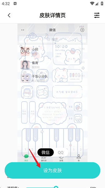 6、在下方选择微信后点击设为皮肤即可将该壁纸设定为微信皮肤。