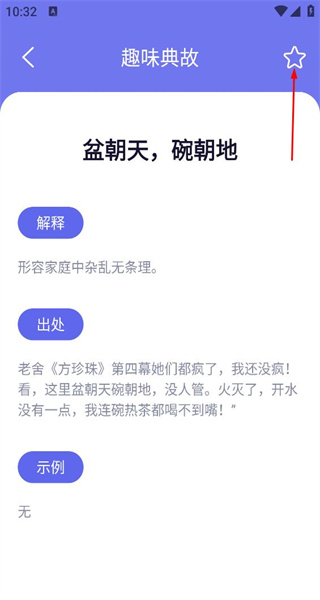 4、进入趣味典故详情页面,能够查看成语的解释、出处等相关内容,点击页面右上角的星星按钮,即可收藏该典故。