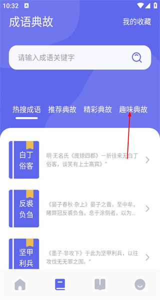 2、进入成语典故页面后,点击“趣味典故”标签,即可切换到该分类对应的成语列表,进而查看其中展示的典故内容。