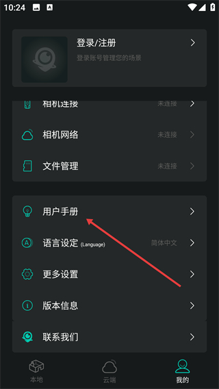 2、进入【我的】页面后,点击【用户手册】选项,不仅可以查阅产品使用指南,还能完成相机连接、语言设置等相关功能操作。