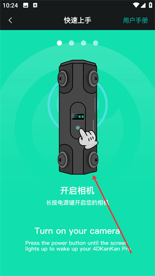 4、在【快速上手】页面,根据指引长按电源键即可开启相机,此指南是【四维看看Pro】的基础操作教程。