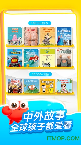 囊括了由迪士尼授权的白雪公主和七个小矮人、小熊维尼、超人总动员、狮子王、冰雪奇缘、寻梦环游记,以及海底小纵队、超级飞侠等海量的经典儿童故事、睡前故事、有声故事、儿歌、绘本故事、儿童读物、讲故事、绘本、漫画、视频、听书、童话、童谣、古诗、英语、胎教、三字经、安徒生童话、格林童话等上万本宝宝喜欢的中、英文有声故事绘本。