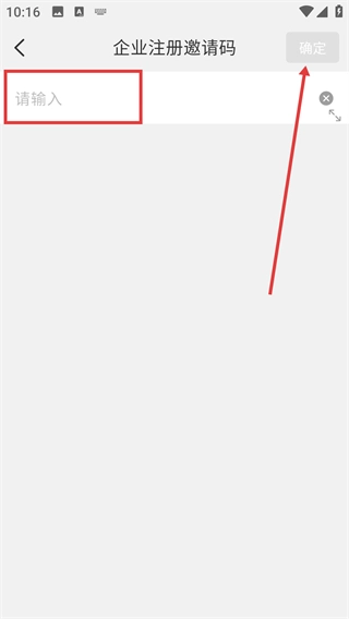 2、进入【企业注册邀请码】页面,在对应的输入框中填写邀请码,填写完毕后点击页面右上角的【确定】按钮,就能提交邀请码相关信息。