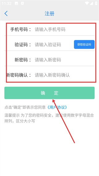2、填写【手机号码】和【验证码】,设置【新密码】并再次确认,点击【确定】就完成注册了,注册后能使用该账号登录应用。