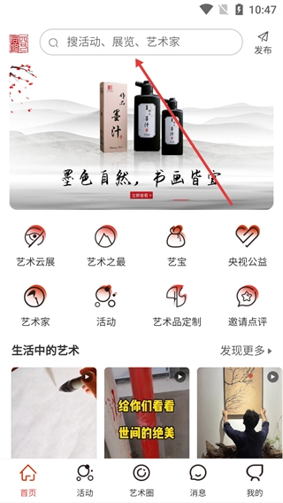 1、找到页面顶部显示“搜活动、展览、艺术家”提示文字的搜索框,点击这个搜索框就能进入搜索界面,为输入内容做好准备。