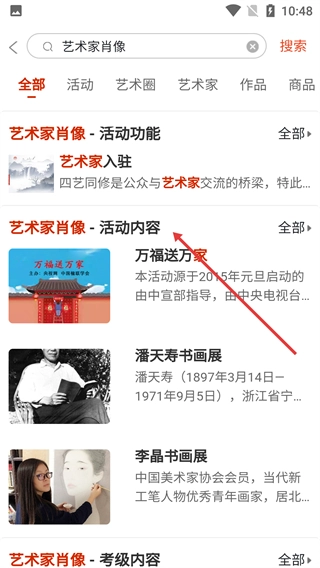 4、进入【艺术家肖像】搜索结果页面后,查看【艺术家肖像-活动内容】板块,能找到像【万福送万家】这类相关活动信息。