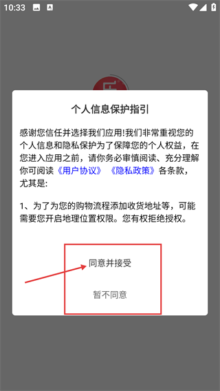 进入应用前,请先查阅【用户协议】和【隐私政策】,在了解个人信息保护相关条款后,点击【同意并接受】按钮,即可进入应用主界面。
