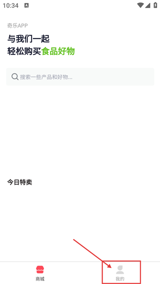 在【奇乐】主界面,你可以通过底部的【我的】入口进入个人功能模块,也能利用搜索栏查找各类食品好物。