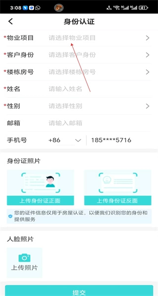4、进入身份认证页面后,按顺序选择物业项目、客户身份等相关信息,填写姓名等所需内容,为提交做准备。