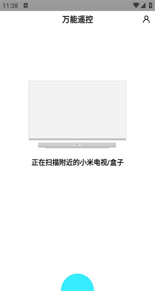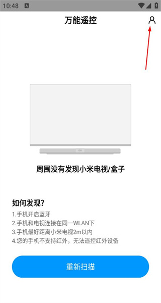 1、打开万能遥控软件,扫描设备后显示未发现小米电视,点击右上角头像,进入个人中心页面。