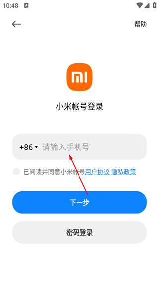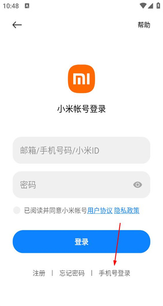 3、在小米账号登录页,点击手机号登录选项,切换至手机号登录的信息填写界面。