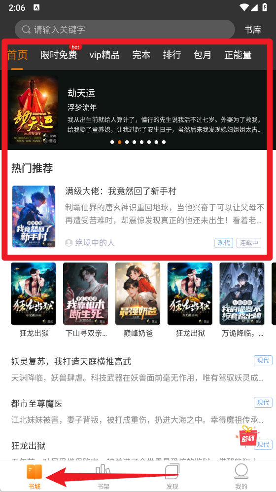 2、在书城栏目中,可以浏览热门推荐、限时免费、包月书库等板块,选择并阅读自己喜欢的小说。