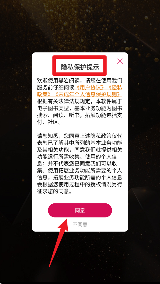 1、首次进入app时,用户需仔细阅读用户协议、隐私政策等内容,并点击同意按钮完成确认。