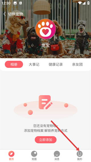 1、在展示【相册-大事记-健康记录-亲友团】的页面,点击底部的【我的】按钮,即可进入能够对宠物档案进行相关操作的个人界面。