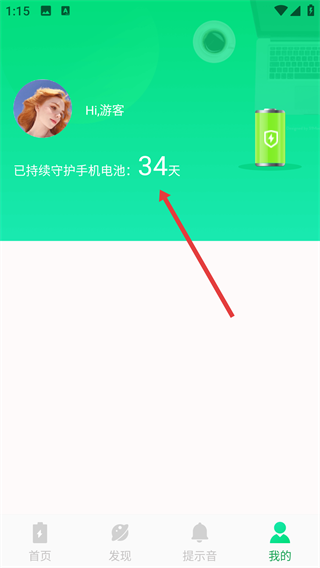 3、进入“我的”页面,找到并查看【已持续守护手机电池-34天】的信息,以此了解该应用为手机电池提供守护的时长情况。