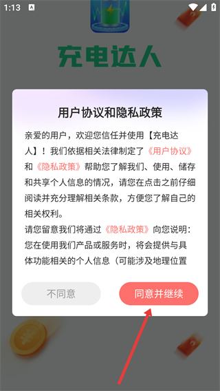 1、仔细阅读【用户协议】与【隐私政策】,在清楚知晓个人信息的使用规则后,点击【同意并继续】按钮,即可进入【充电达人】的功能操作界面。