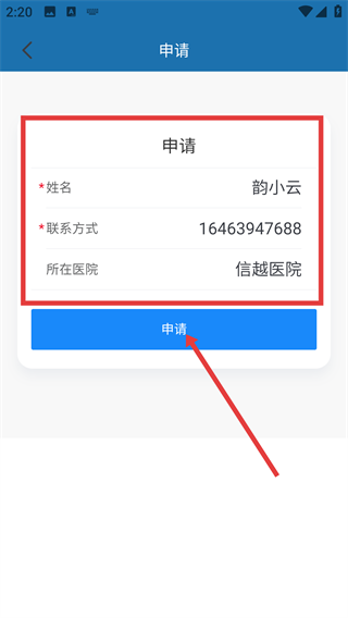 3、进入申请表单页面后,依次填写姓名、联系方式、所在医院等相关信息,随后点击【申请】按钮,即可提交顾问身份的申请资料。