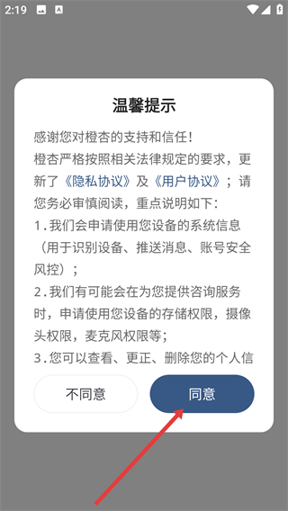 1、仔细阅读橙杏平台的《隐私协议》《用户协议》以及各项权限说明,确认无误后点击【同意】按钮,即可进入账号相关的操作界面。