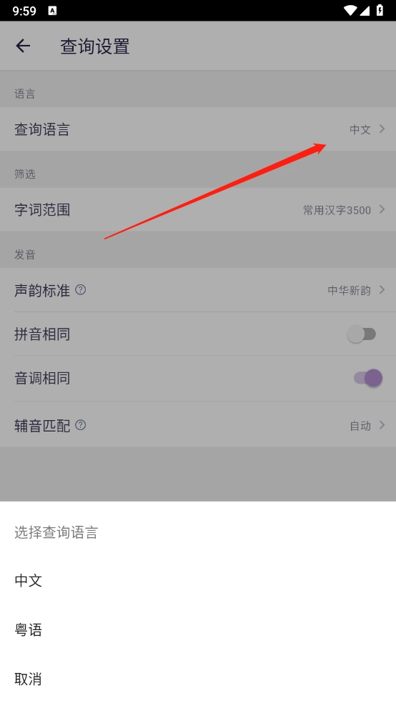 4、然后点击“查询语言”,在出现的语言列表中选择更换即可。