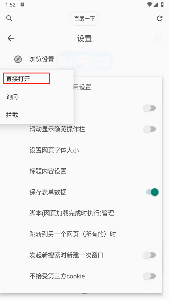 4、点击“网页打开外部应用设置”后,选择“直接打开”选项即可完成设置。