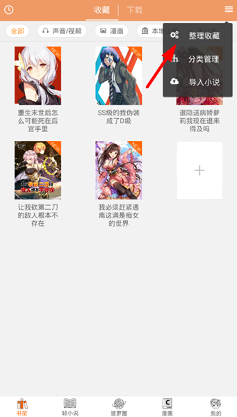 2、在这里用户可以看见你书架中所有的书籍,在右上角点击按钮后找到整理收藏。