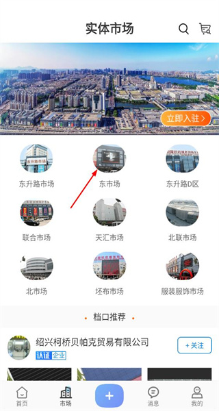 2、在实体市场页面,选择东市场选项,进入该市场的详情界面,查看市场内的商家信息。