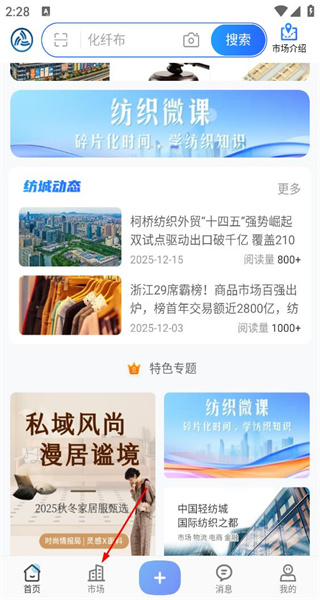 1、打开软件首页,可浏览纺织微课等内容,点击底部市场选项,进入实体市场页面。