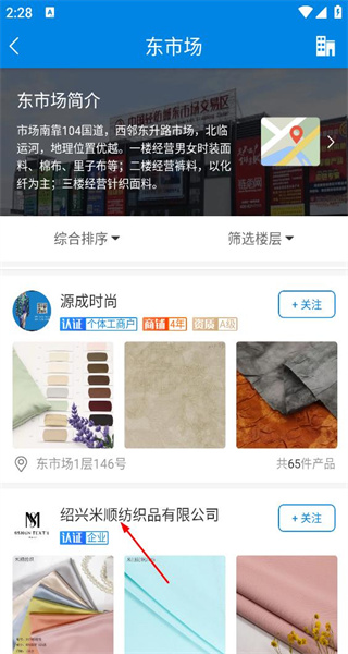 3、在东市场页面,选择绍兴米顺纺织品有限公司,进入该商家的店铺界面查看商品。