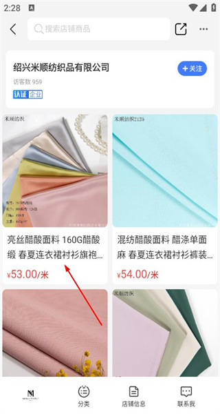 4、在商家店铺页面,浏览展示的纺织商品,查看亮丝醋酸面料等商品的价格及详情信息。