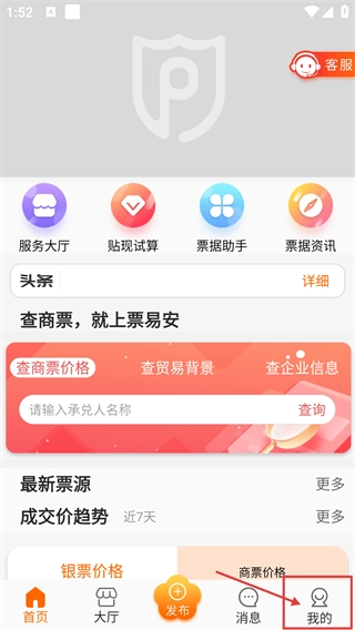 1、进入【票易安】首页,可使用【服务大厅】【贴现试算】等功能,点击底部【我的】按钮,可进入账户相关操作界面。
