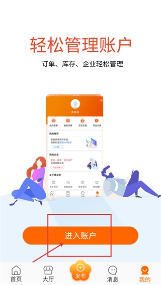 2、在【我的】界面,点击【进入账户】按钮,即可进入账户管理页面,实现订单、库存、企业信息的集中管理。