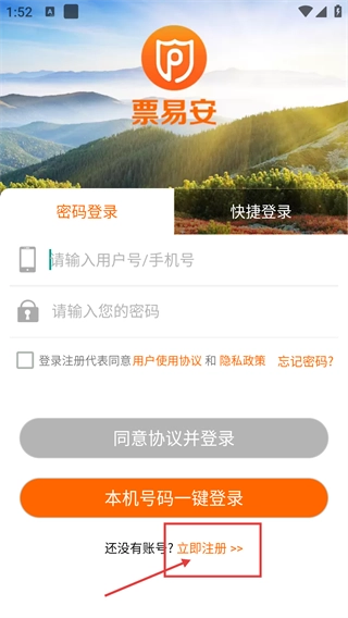 3、在【票易安】登录界面,若无账号可点击【立即注册】,也能选择【本机号码一键登录】等方式完成账号登录。