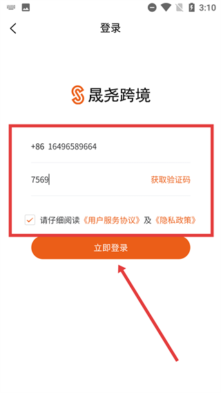 3、在登录页面,填写手机号、获取并输入验证码,勾选《用户服务协议》及《隐私政策》后,点击【立即登录】按钮,完成账号登录操作。