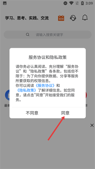 1、阅读《服务协议》《隐私政策》的条款说明后,点击弹窗中的【同意】按钮,进入应用的功能界面。