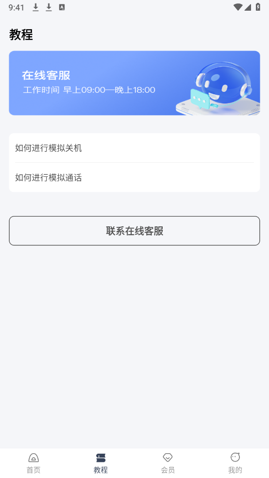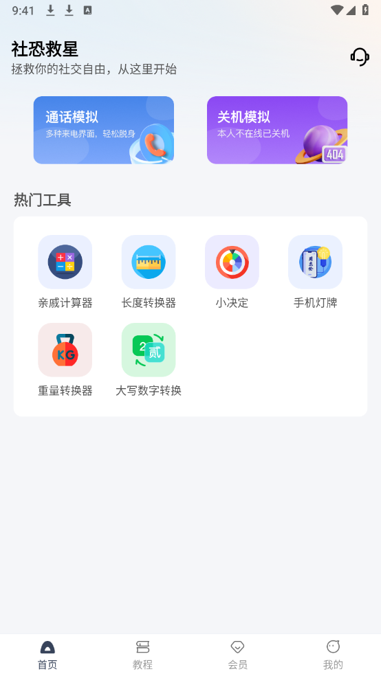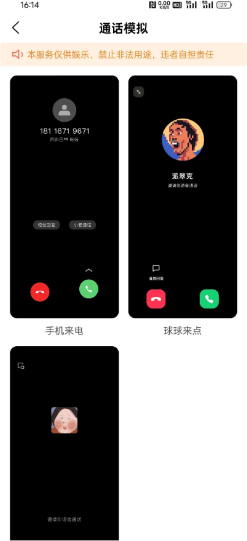 1、先打开社恐救星,进入首页后,您会看到顶部的模拟通话功能,点击进入通话模拟的列表页面,然后选择您想用的手机来电、球球或VV语音通话模式。