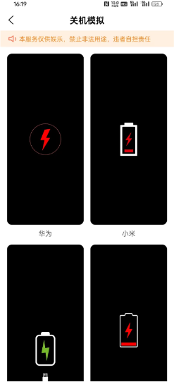 1、先打开社恐救星,进入首页后,您会看到顶部的关机模拟功能,点击进入关机模拟的列表页面,选择与您当前使用的手机品牌对应的电量低已关机选项。