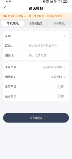 5、接着回到来电设置界面,你可以自行决定是否开启手机的振动和铃声功能,设置完成后点击“立即创建”按钮。要是你选择了“立即来电”模式,系统就会马上模拟来电弹出;要是选择了“延迟来电”,手机会自动进入黑屏状态,等设定的延迟时间一到,模拟来电就会准时响起。这时你就能借此快速离开让你感到社恐的场合啦~
