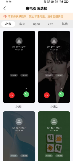 3、接着选择来电页面,这里有众多品牌以及各式各样的背景图,您可以按照自己的想法进行挑选。