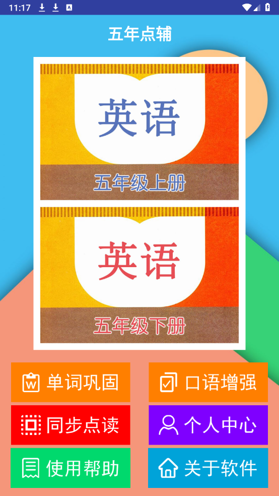 进入软件后,能看到涵盖五年级英语学习的多个板块,单词、口语以及课本同步学等内容都包含在内。